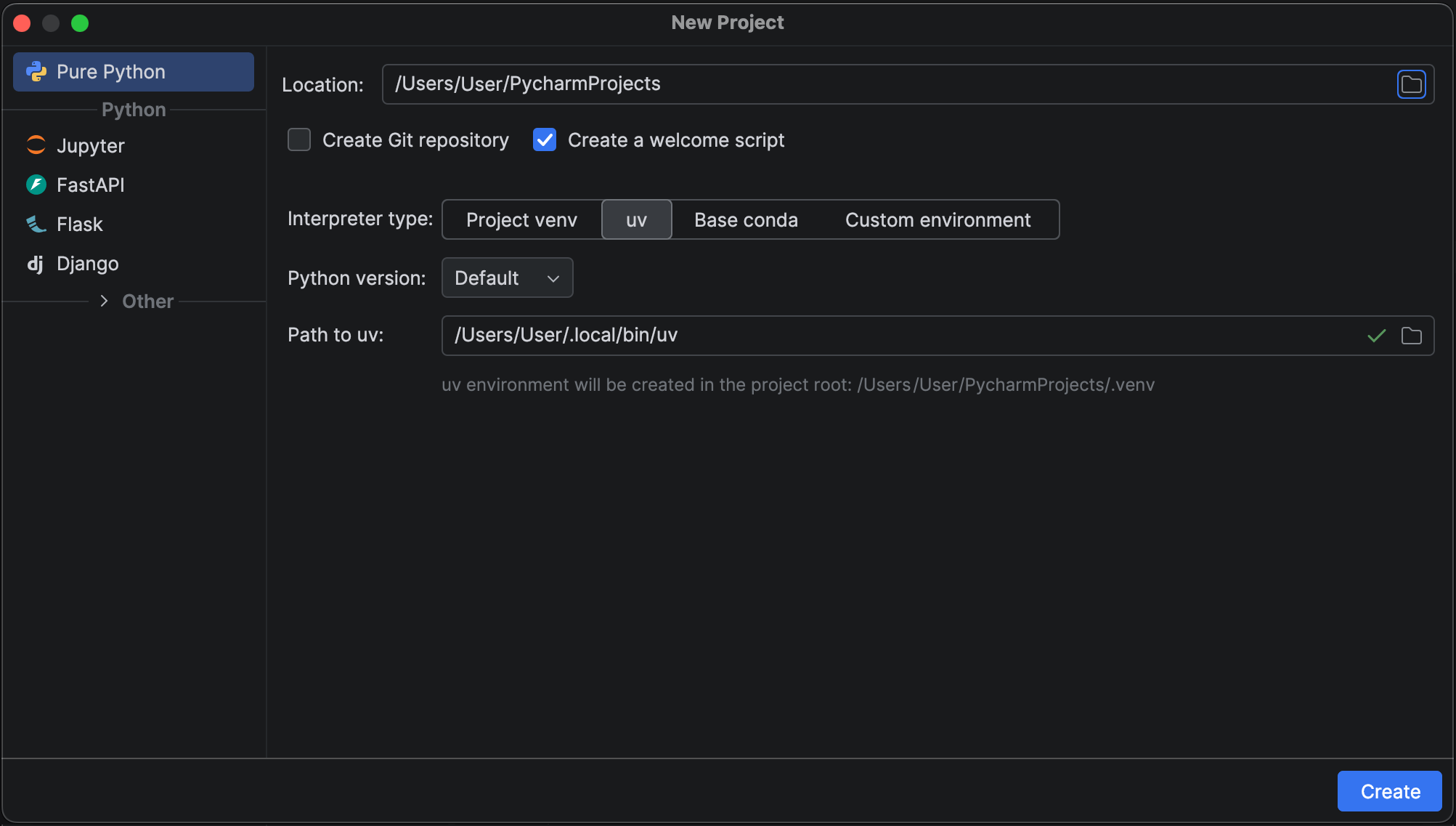 uv 由 Astral 开发,是 Rust 编写的超高速 Python 包安装器 & 环境管理器(比 pip 快数十倍),现被 PyCharm 官方“钦定”: