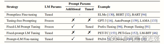 上表为,不同的调优策略的特点。“Additional”表示在LM参数之外是否有其他参数,而“Tunned”表示参数是否被更新。