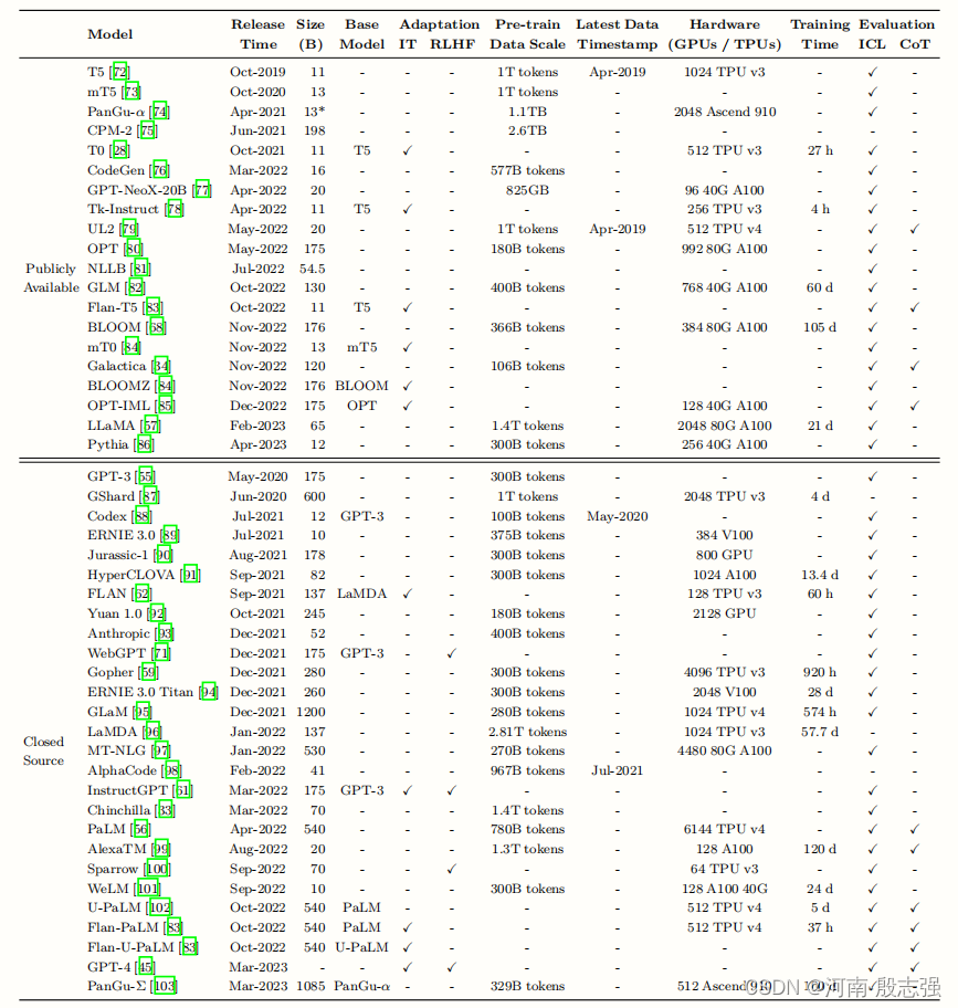 近年来大型语言模型(指规模大于10B的模型)的统计数据,包括Evaluation、Pre-trainDataScale(以token数量或存储大小表示)和Hardware。在本表中,我们仅列举有公开论文介绍技术细节的大语言模型。这里,“ReleaseTime”表示相应论文正式发布的日期。“PubliclyAvailable”表示模型检查点可以公开获取,而“ClosedSource”则相反。“Adaptation”指模型是否经过了后续微调:IT表示指令微调,RLHF表示人类反馈的强化学习。“Evaluation”表示模型是否在原始论文中评估了相应的能力:ICL表示上下文学习,CoT表示思维链。“*”表示最大的公开可用版本。