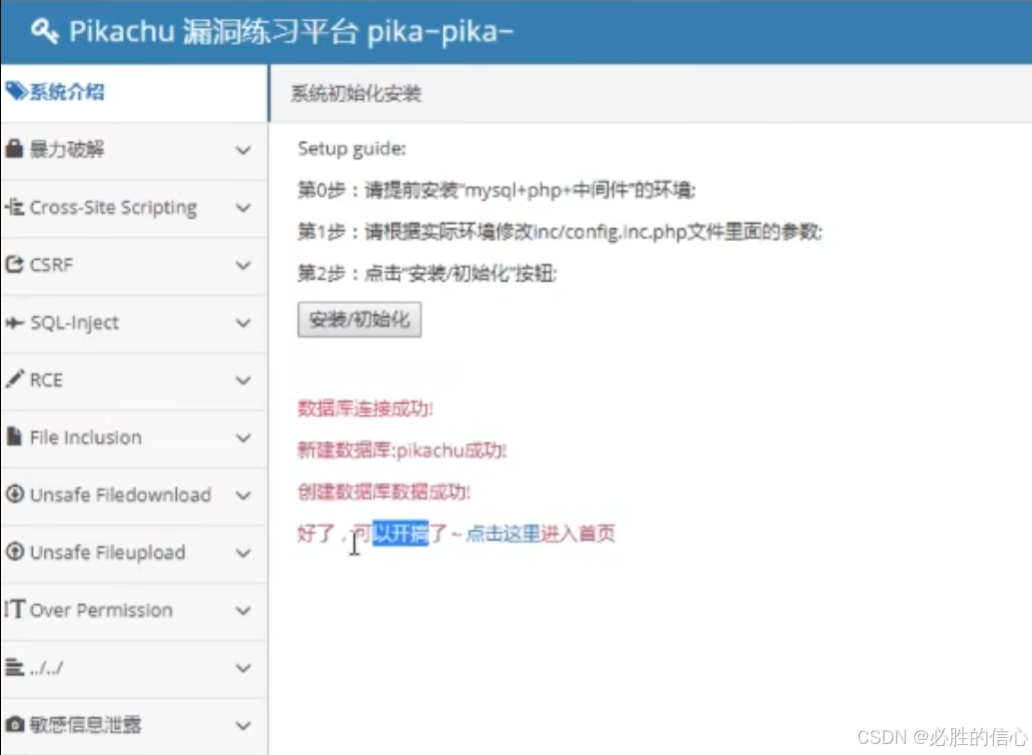 按照其他讲解安装phpstudy和pikachu之后打开网址依旧出现连接数据库失败的提示。这时候需要先初始化安装,如果页面没有出现初始化安装的提示,需要在url后面增加install.php。例如默认地址就是http://localhost/pikachu-master/install.php。然后就会出现初始化安装的界面。