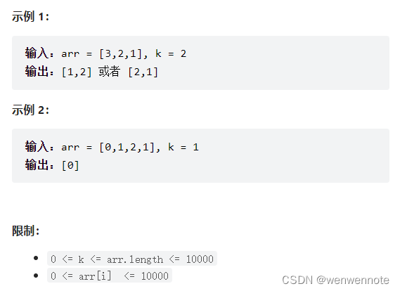 输入整数数组 arr ,找出其中最小的 k 个数。例如,输入4、5、1、6、2、7、3、8这8个数字,则最小的4个数字是1、2、3、4。