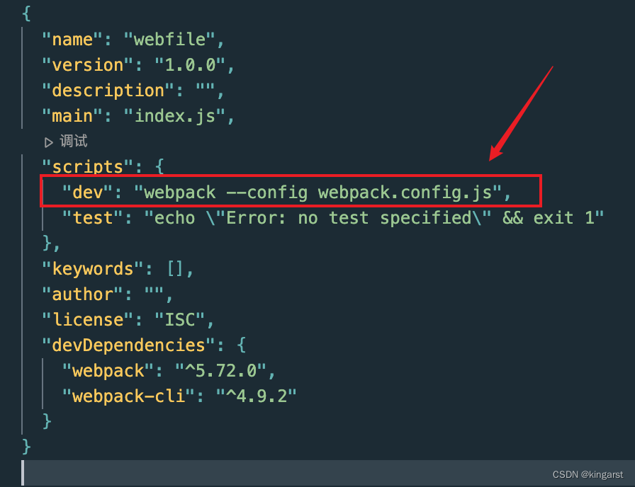 代码为:"dev": "webpack --config webpack.config.js",
