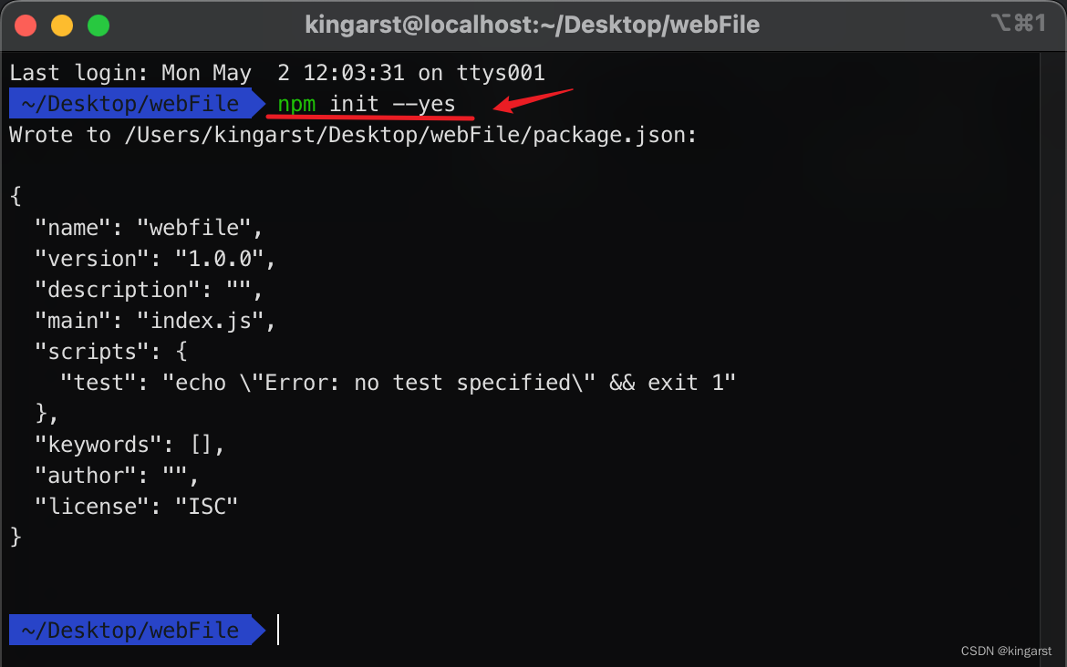 任意新建一个空文件夹,取名为webFile,进入到文件夹内部,用 npm init --yes 命令来生成一个package.json,请看截图展示: