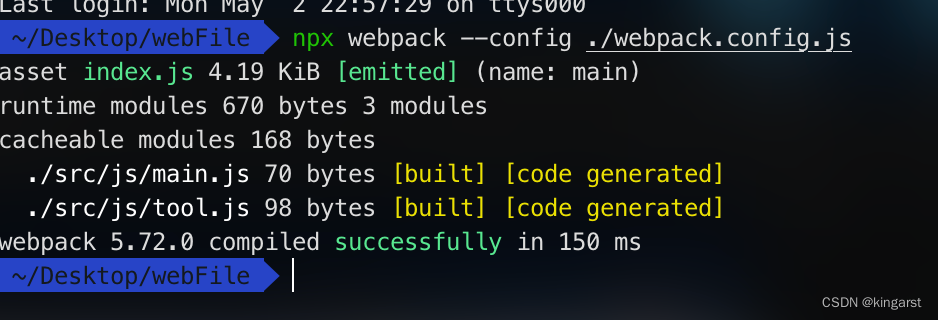 在这里,由于我们已经配置了入口文件,我们只需要输入npx webpack命令进行打包,见下图: