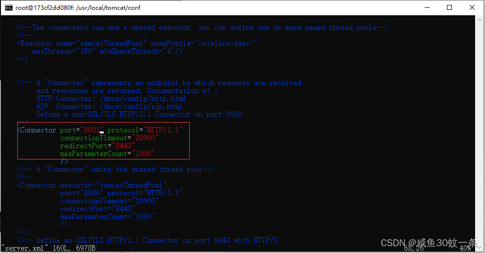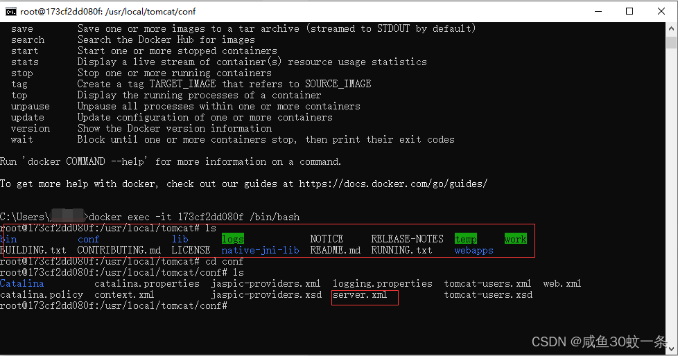 4.docker exec -it 173cf2dd080f /bin/bash: (绿色是cantainerId)进入应用程序的目录,找到conf下的server.xml文件进行端口配置,因为tomcat默认端口号8080,开启了两个应用但是端口号都是8080,所以需要修改其中一个端口