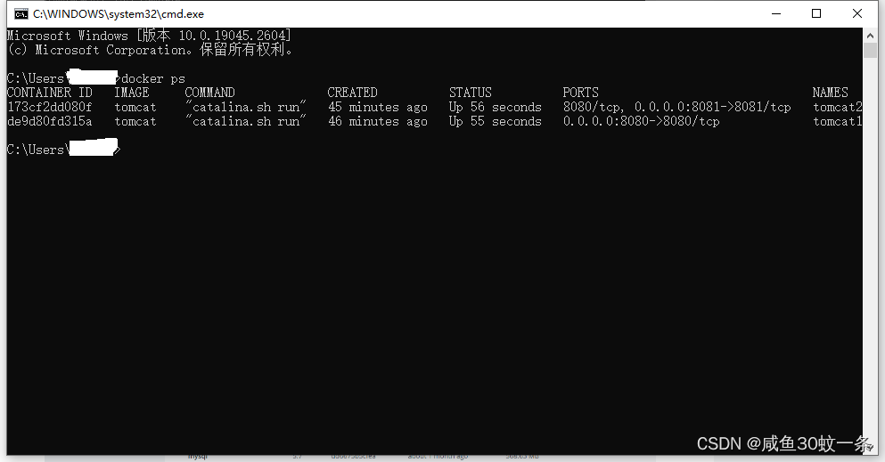 3.docker ps:查看创建的容器,可以看到我们建了两个不同端口的tomcat