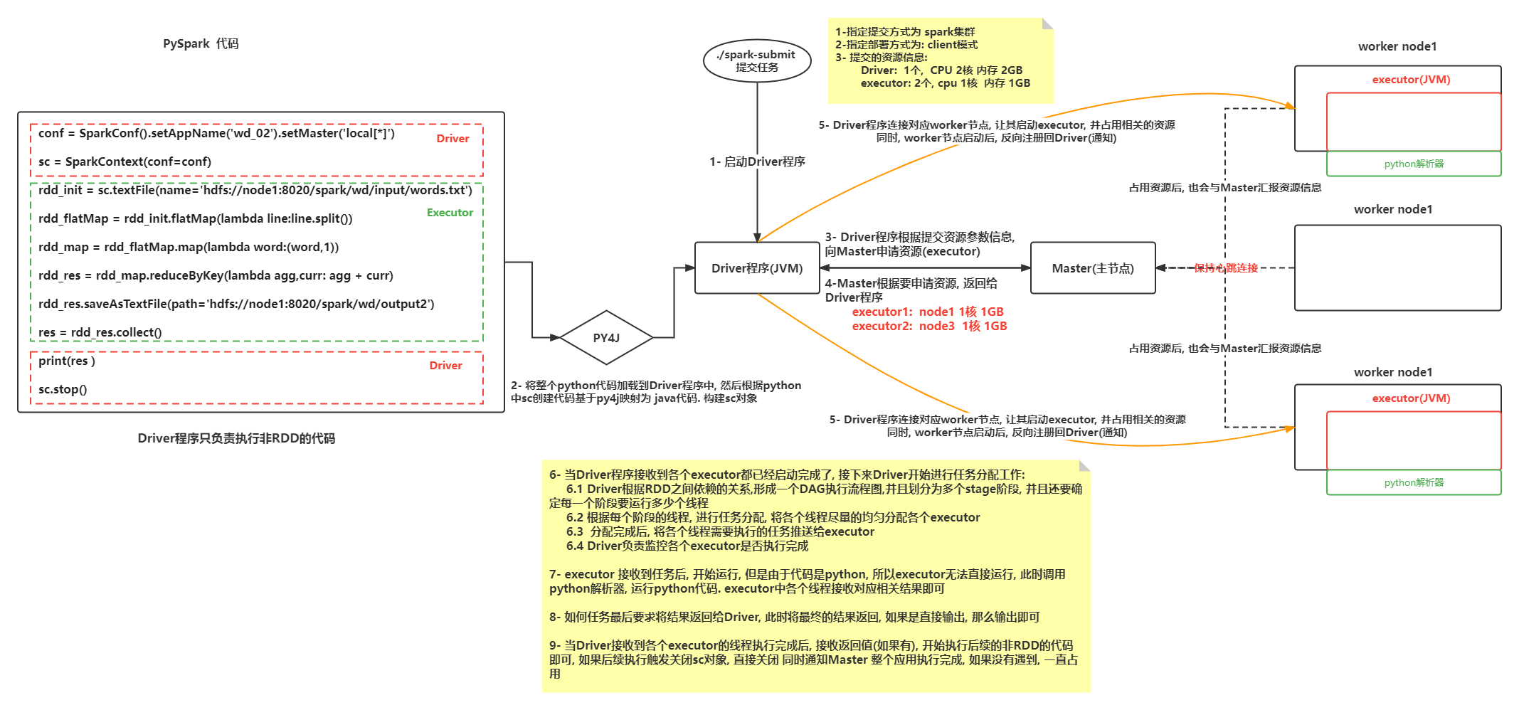 关于spark程序与pyspark的交互流程 9- 当Driver接收到各个executor的线程执行完成后, 接收返回值(如果有), 开始执行后续的非RDD的代码即可, 如果后续执行触发关闭sc对象, 直接关闭 同时通知Master 整个应用执行完成, 如果没有遇到, 一直占用。7- executor 接收到任务后, 开始运行, 但是由于代码是python, 所以executor无法直接运行, 此时调用python解析器, 运行python代码. executor中各个线程接收对应相关结果即可。executor1: node1 1核 1GB。