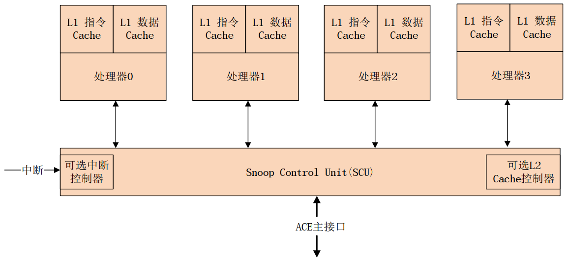 Cortex-A7 MPCore 支持在一个处理器上选配 1~4 个内核, Cortex-A7 MPCore 多核配置如图6.1.1 所示:
