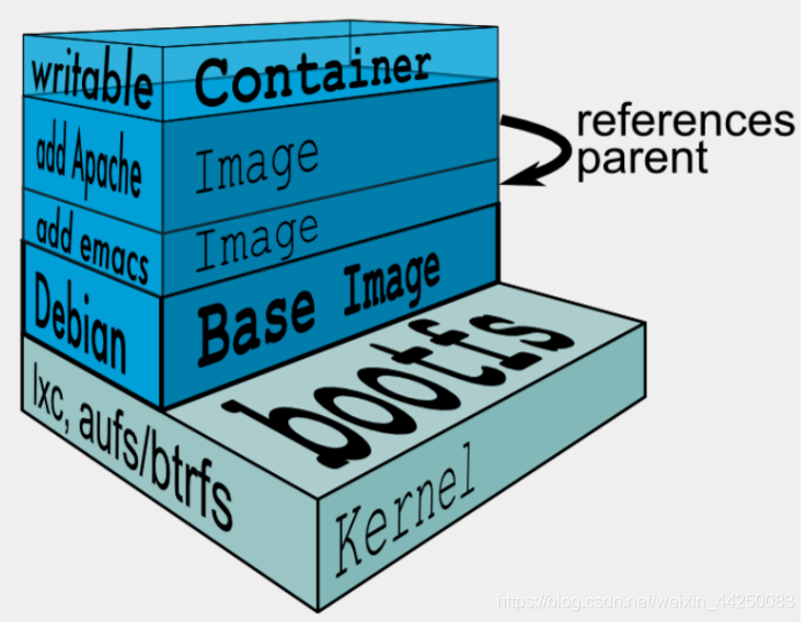 我们首先需要明确一点,镜像是只读的。每一层都只读。在上图上,我们可以看到,在内核之上,最底层首先是一个基础镜像层,这里是一个debian的基础镜像,因为镜像的只读特性,如果我们想要在这个debian的基础镜像上安装一个emacs编辑器,则只能在基础镜像之上,在构建一层新的镜像层。同样的道理,如果想要在当前的emacs基础镜像层之上添加一个apache,则只能在其上再构建一个新的镜像层。而这即是镜像的分层特性。