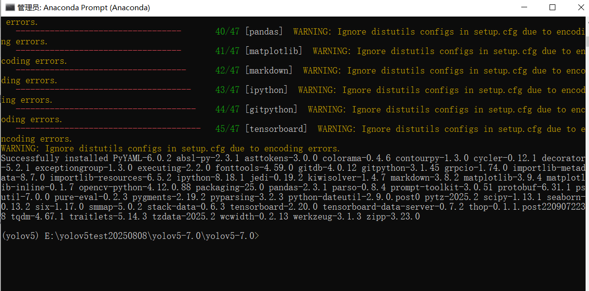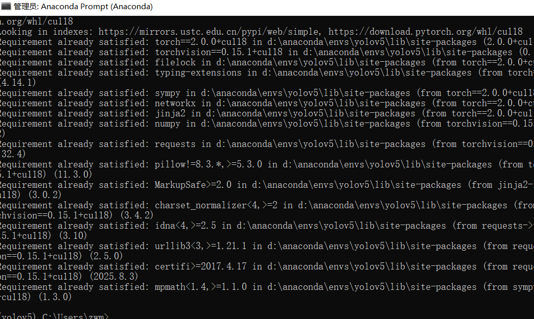 需要通过anaconda prompt 进入yolov5环境中,按照下图cd到yolov5根目录下,我的是E:\yolov5test20250808\yolov5-7.0\yolov5-7.0。之后输入指令“pip install -r requirements.txt”。
