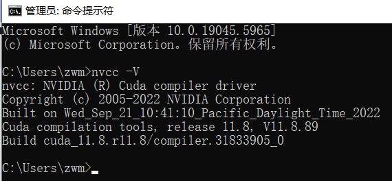 安装完成后在cmd里输入nvcc -V,显示如下即代表安装成功: