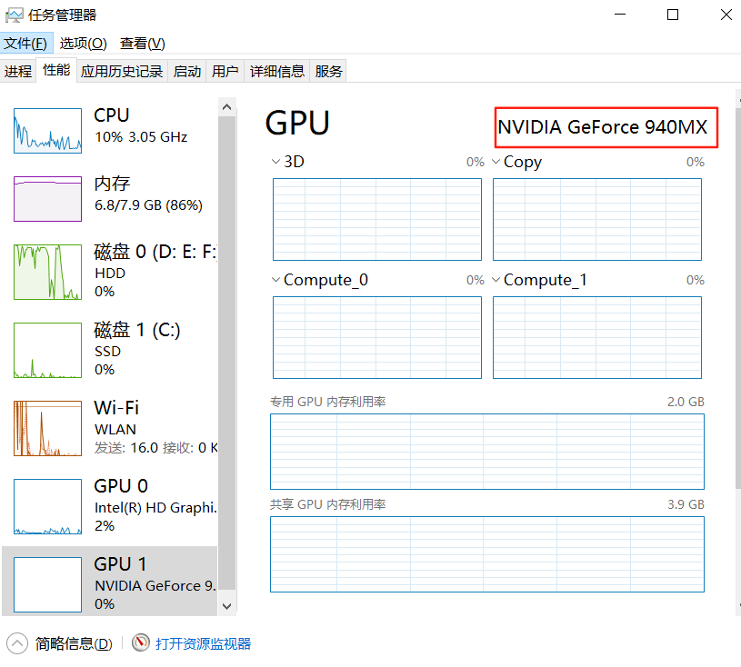 1.查看电脑状况,“任务管理器-性能-GPU”,看是否有独立显卡