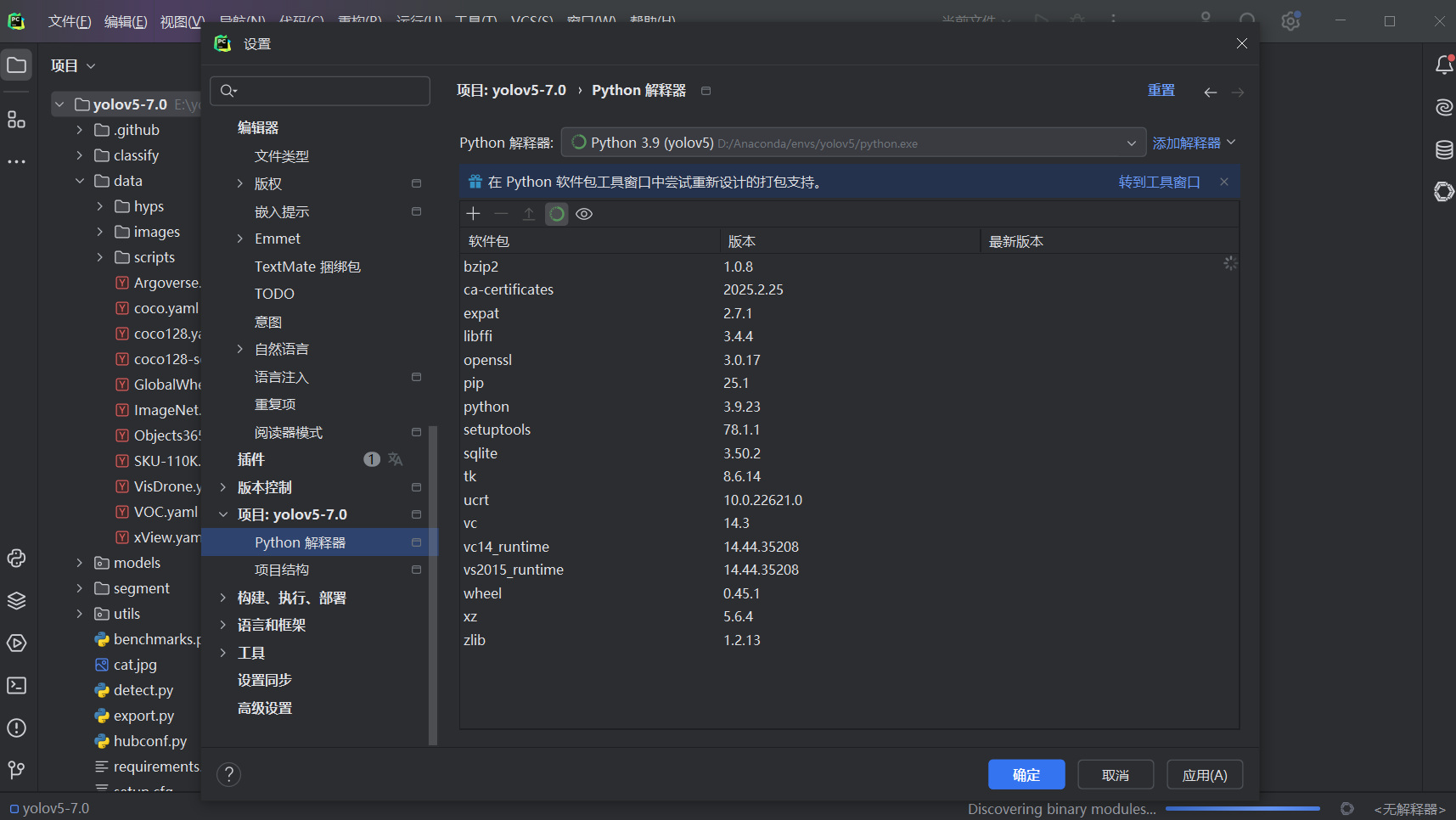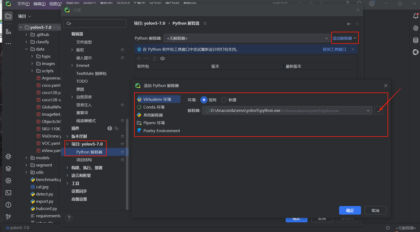 英文版:点击file-settings,点击project:ultralytics,点击python interpreter,点击右边add....。