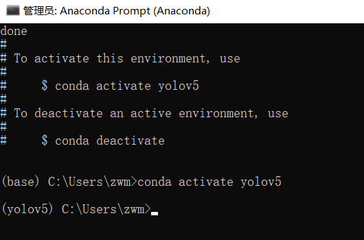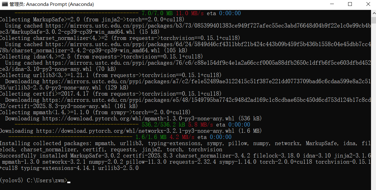 打开prompt 输入conda activate yolov5进入yolov5环境,之后输入如下代码即可安装pytorch,耐心等待安装完成(需要注意关闭加速软件否则会下载失败)