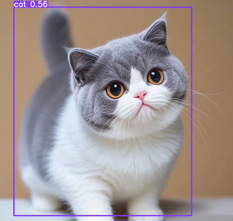此时可以去网上下载一只猫猫的jpg图片,将其放到data/images目录下。检测环境是否有问题可以运行detect.py。显示如下界面说明运行成功,环境配置正常。