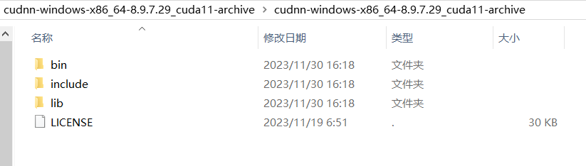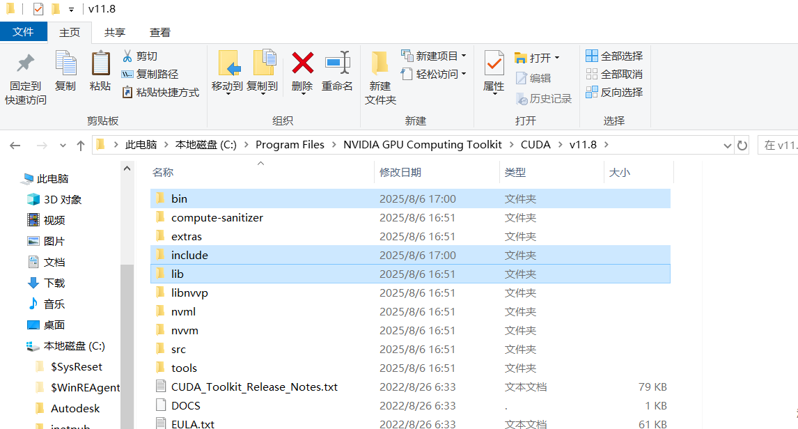 将得到的压缩文件进行解压,解压后得到下图三个文件夹,全选复制进cuda的文件夹中进行覆盖替换,替换完成后即cudnn安装完成。按照本文教程安装的cuda的文件夹默认在 C:\Program Files\NVIDIA GPU Computing Toolkit\CUDA\v11.8 目录下。