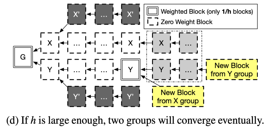 通过这种方法,在安全性上,等价于将 GHOST 的区块生成速率降低至 1/h。而前文所述的攻击方式,只在区块生成速率很高时成立。这样,就解决了 GHOST 的活性攻击问题。