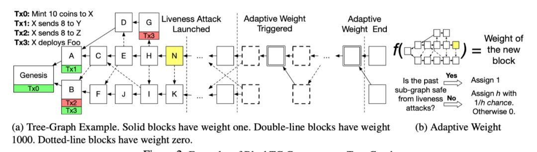 论文首先指出了,当我们通过调整工作量证明的参数,调高区块生成速率时,中本聪共识协议存在安全性的问题,而 GHOST 共识协议存在活性攻击的问题。