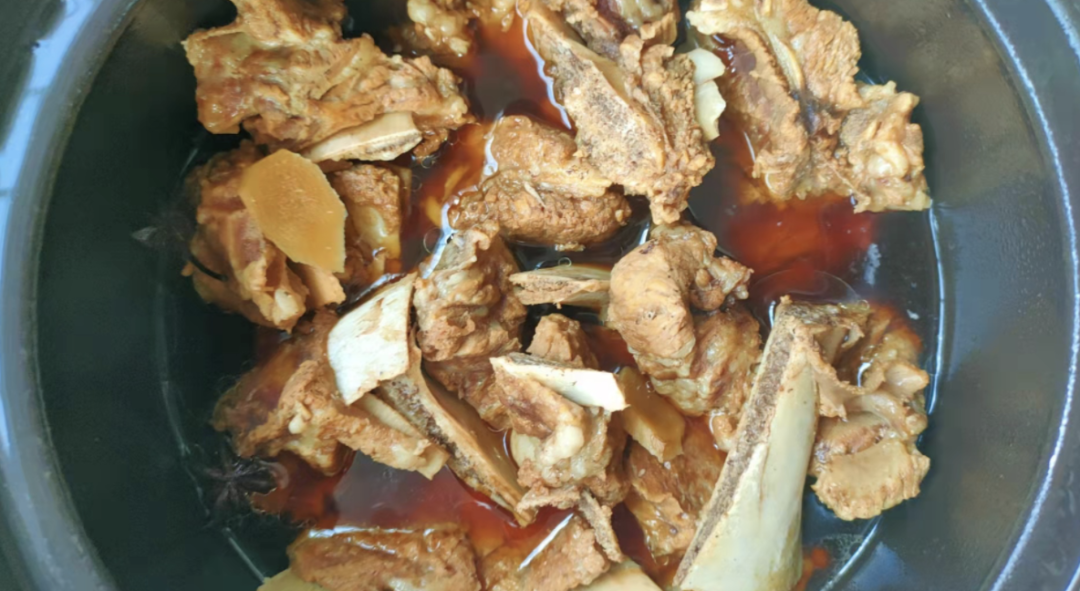 锅内放入排骨,加水没过排骨,加一把冰糖;