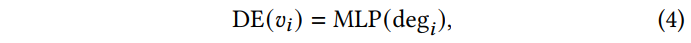 (2)基于度的位置编码:在图数据中,节点的度可以表示其周围邻居结构的复杂程度,而度越大的节点可能具有更复杂的局部结构。许多真实世界数据中的度分布具有幂律性质,表明中心节点和注意样本的度可能是不同的。对于任意一个度为degi的节点𝑣i,基于度的位置编码(DE)为: