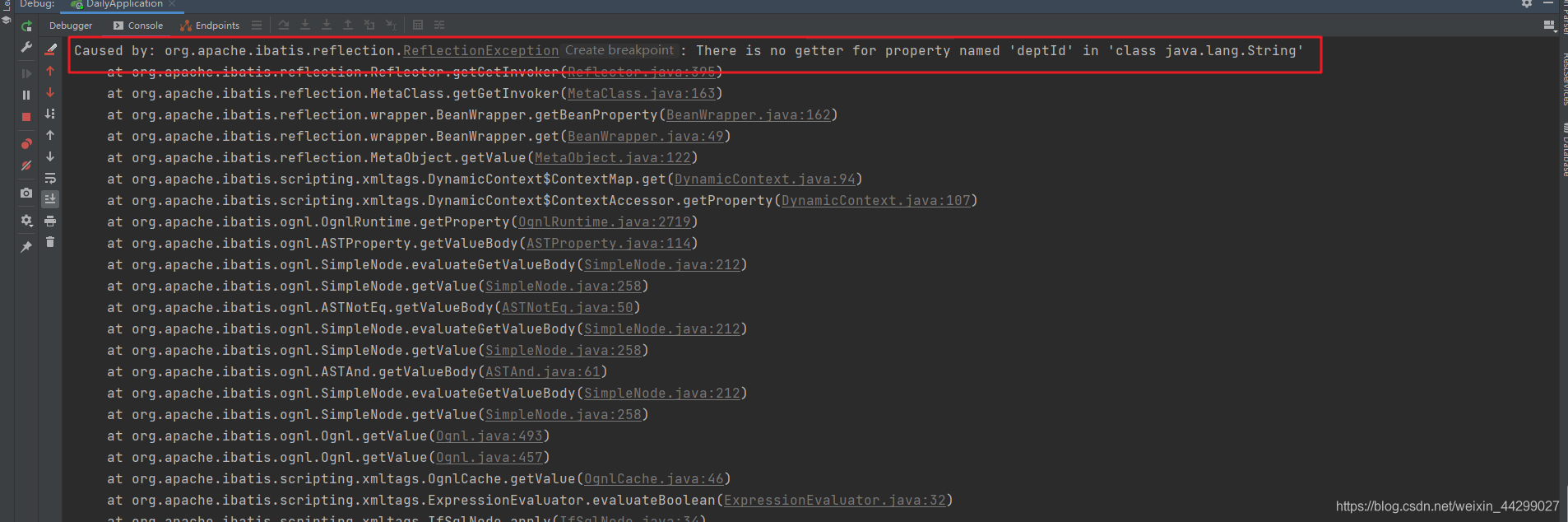 最近在项目中调试接口的时候遇到这样一个问题,mybatis解析时出错:org.mybatis.spring.MyBatisSystemException: nested exception is org.apache.ibatis.reflection.ReflectionException: There is no getter for property named 'deptId' in 'class java.lang.String',如下图所示: