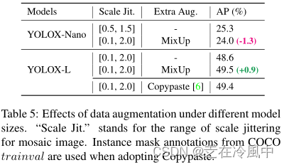 对于大型模型,我们还发现更强的增强更有帮助。事实上,我们的MixUp实现比[38]中的原始版本更重。受Copypaste[6]的启发,我们在混合之前通过随机采样比例因子抖动了两幅图像。为了了解Mixup与缩放抖动的威力,我们将其与YOLOX-L上的Copypaste进行了比较。注意到Copypaste需要额外的实例掩码注释,而MixUp不需要。但如表5所示,这两种方法实现了具有竞争力的性能,表明当没有实例掩码注释可用时,具有缩放抖动的MixUp是Copypaste的合格替代品。