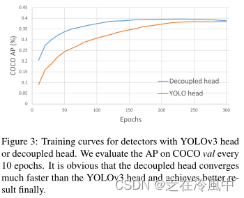 我们的两个分析实验表明,耦合检测头可能会损害性能。1). 如图3所示,用解耦的YOLO头替换YOLO头大大提高了收敛速度。2).解耦的头部对于YOLO的端到端版本至关重要(将在下面描述)。从表1中可以看出,耦合头的端到端的yolo性能降低4.2%AP,而解耦头的端到端的Yolo降低0.8%AP。因此,我们将YOLO检测头替换为如图2所示的轻度去耦头。具体而言,它包含一个1×1凸面层以减少通道尺寸,然后是两个平行分支,分别具有两个3×3凸面层。我们在表2中报告了V100上批次=1的推断时间,并且精简解耦头带来了额外的1.1毫秒(11.6毫秒vs.10.5毫秒)。