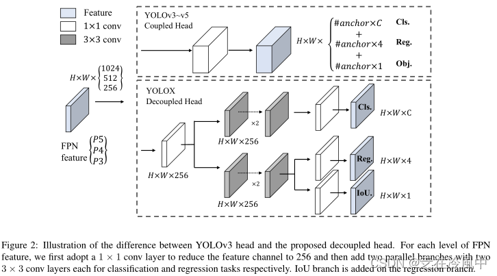 Decoupled head:在对象检测中,分类和回归任务之间的冲突是一个众所周知的问题。因此,用于分类和定位的去耦头广泛用于大多数一级和二级检测器。然而,随着YOLO系列的主干和特征金字塔(例如,FPN、PAN)的不断发展,它们的检测头保持耦合,如图2所示。