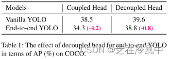 End-to-end YOLO:我们遵循[39]添加两个额外的对流层、一对一的标签分配和停止梯度。这些使检测器能够以端到端的方式执行,但稍微降低了性能和推理速度,如表2所示。因此,我们将其作为一个可选模块,而不涉及最终模型。