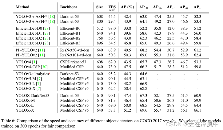 Modified CSPNet in YOLOv5:为了进行公平的比较,我们采用了精确的YOLOv5主干,包括修改的CSPNet[31]、SiLU激活和PAN[19]头部。我们还遵循其缩放规则来生产YOLOXS、YOLOX-M、YOLOX-L和YOLOX-X型号。与表3中的YOLOv5相比,我们的模型通过∼3.0%至∼1.0%AP,仅边际时间增加(来自去耦头)。