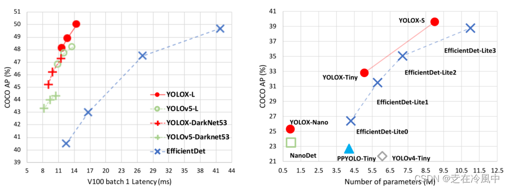 如图1所示,通过对上述技术进行经验丰富的更新,我们在COCO上以640×640分辨率将YOLOv3提高到47.3%AP(YOLOX-DarkNet53),大大超过了YOLOv3的当前最佳实践(44.3%AP,ultralytics版本2)。此外,当切换到采用先进CSPNet主干和额外PAN头的先进YOLOv5架构时,YOLOX-L在COCO上以640×640分辨率实现50.0%的AP,比对应的YOLOv5-L高1.8%的AP。我们还测试了我们在小尺寸模型上的设计策略。YOLOX Tiny和YOLOX Nano(仅0.91M参数和1.08G FLOP)分别以10%的AP和1.8%的AP优于对应的YOLOv4 Tiny和NanoDet3。