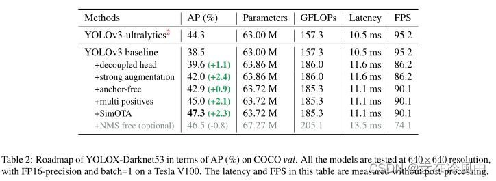 Implementation details:从基线到最终模型,我们的训练设置基本一致。我们在COCO train 2017上对总共300个时期的模型进行了训练,其中5个时期进行了预热。我们使用随机梯度下降(SGD)进行训练。我们使用lr×BatchSize/64(线性缩放)的学习速率,初始lr=0.01,余弦lr调度。重量衰减为0.0005,SGD动量为0.9。对于典型的8-GPU设备,批量大小默认为128。其他批量大小包括单个GPU训练也很好。输入大小以32步幅从448均匀绘制到832。FPS和本报告中的延迟都是在单个特斯拉V100上以FP16精度和批次=1测量的。