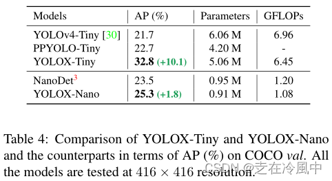 Tiny and Nano detectors:我们进一步将我们的模型缩小为YOLOX Tiny,以与YOLOv4 Tiny进行比较。对于移动设备,我们采用深度卷积来构建YOLOX Nano模型,该模型只有0.91M参数和1.08G FLOP。如表4所示,YOLOX在型号比同类产品更小的情况下表现良好。