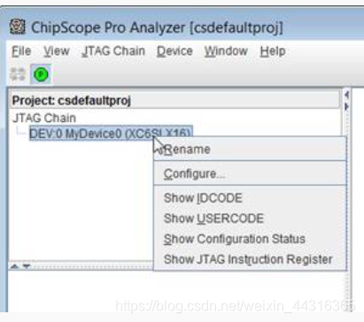 6、在ChipScope Pro Analyzer的左上窗格中,右键单击“项目:Project:csdefaultproj”下列出的JTAG链设备,然后选择“Configure”。通过此对话框添加bit和cdc文件