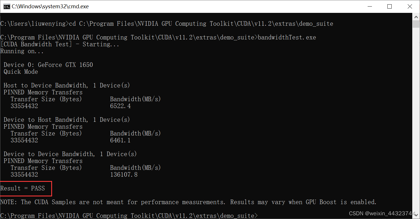 在cmd里,cd到cuda的安装目录:C:\Program Files\NVIDIA GPU Computing Toolkit\CUDA\v11.2\extras\demo_suite,执行两个exe:bandwidthTest.exe和deviceQuery.exe,应该得到下图: