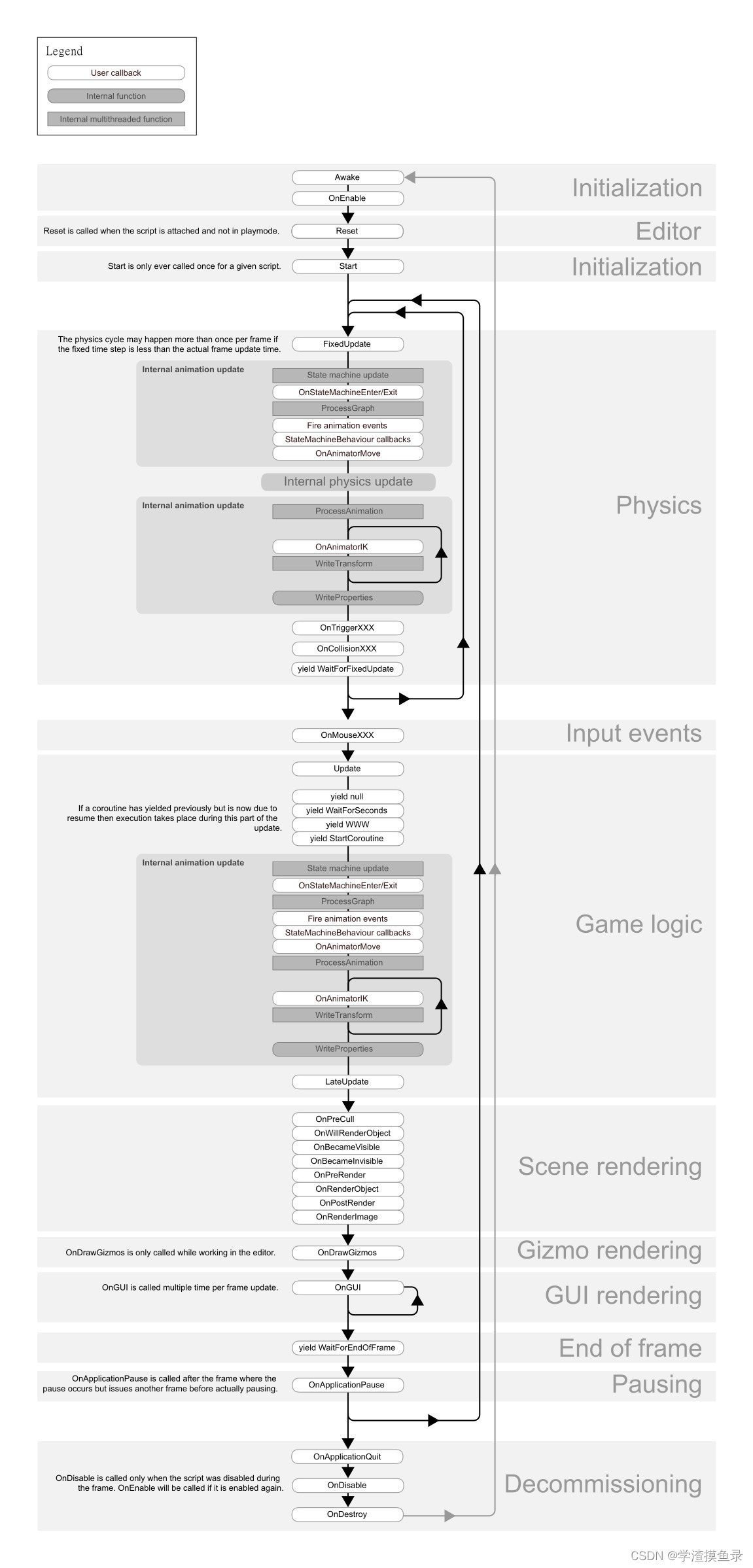 Unity 脚本的生命周期 常见用处是相机跟随主角,比如:主角在 Update 中移动,则可以在 LateUpdate 执行相机的移动,这将可以保证摄像机跟着的时候之前的逻辑一起完全执行完成。Awake 先于 Start,不管脚本启用还是禁用都会执行,常用于在游戏开始前进行初始,可以判断当满足某种条件执行此脚本 this.enable=true。还有很多的生命周期方法,这里没有写全,有些生命周期可能永远也不会的用上,用的上的时候去查就行了。通常的游戏逻辑都写在这里,比如:和玩家交换,当用户按下空格时进行执行什么操作。