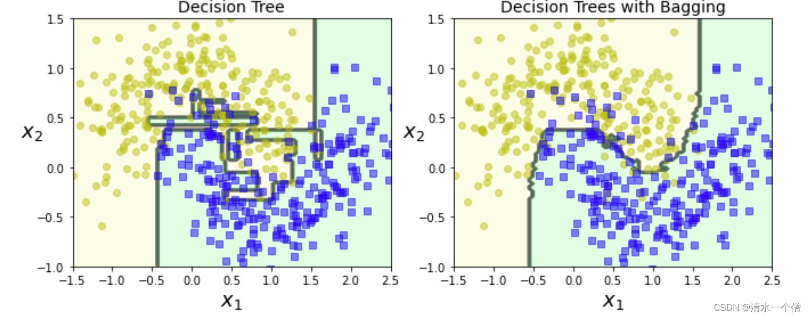 训练了一个包含500个决策树分类器的集成,每次随机从训练集中采样100个训练实例进行训练,然后放回。