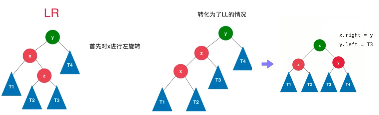 对于这种情况我们需要先进行右旋转操作,转成LL的情况,再进行左旋转: