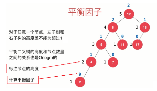 为了更好的维护AVL树的自平衡,我们可以在每个节点中,标注该节点的高度,并计算该节点的平衡因子。平衡因子就是左子树的高度减去右子树的高度。