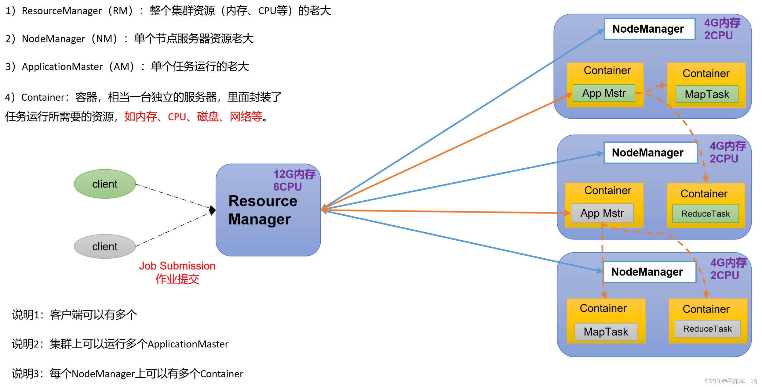 - YARN 负责管理计算资源,并能够同时支持多种计算框架,其中包括 MapReduce。