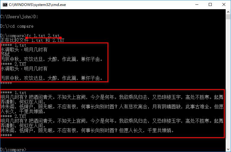 最后就是使用fc命令来比较两个txt文档的不同之处。
