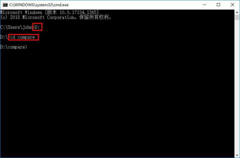 接着输入命令“cd compare”并按Enter键运行,进入两个txt文件所在的文件夹compare中。