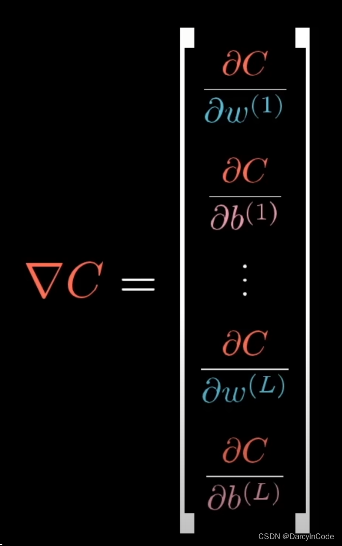 公式表示对于整个神经网络的梯度,包括所有层的权重 w 和偏置 b。损失函数 C 对于每一层的权重和偏置的导数,表示为一个向量或矩阵