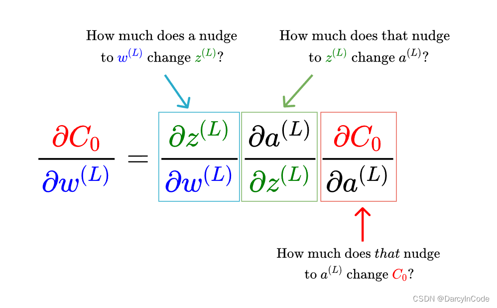 推动 w(L)会导致 z(L)的变化。z(L) 的变化会导致 a(L)的变化,a(L) 的变化会直接影响成本 C0,这个也叫做链式法则。