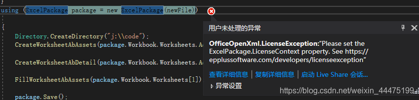 网上关于EPplus的资料很少,所有半天没找到问题在哪,后来重新下载EPplus后了名为readme.txt自述文档,从中可得知使用EPplus必须设置LicenseContext参数;