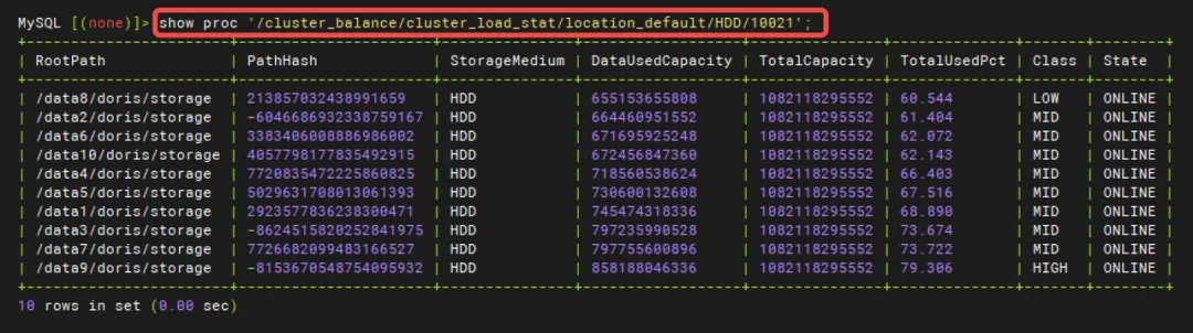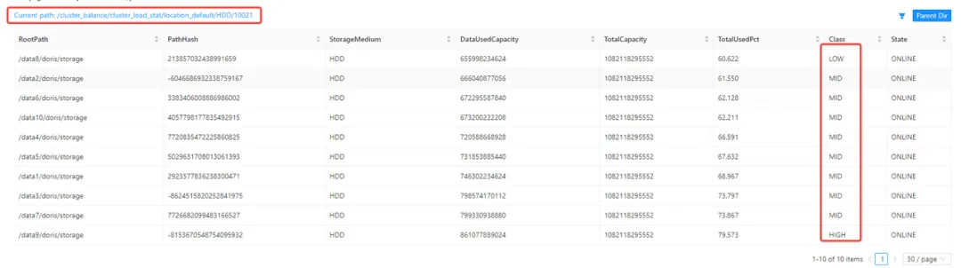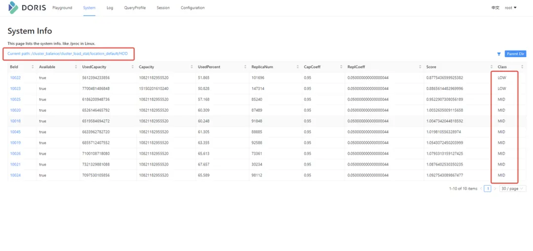 其中Class的等级分别为LOW/MID/HIGH,当Class均为MID时,代表当前集群的BE之间和单个BE的磁盘之间数据已均衡。均衡的权重可通过参数进行调整,详细参数见参数调优小节。
