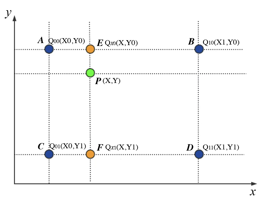 左上角 A(X0,Y0,Q00)、右上角 B(X1,Y0,Q10)、左下角 C(X0,Y1,Q01)、右下角 D(X1,Y1,Q11); - 目标:求网格内部任意点 P(X,Y) 的 Q 值 Q(X,Y)。