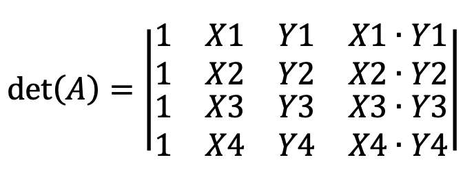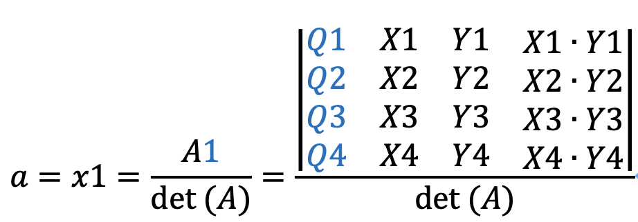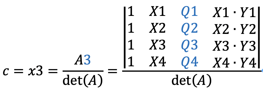其中 a,b,c,d 是由4个系数,可由顶点坐标和Q值确定。(类似一维线性插值y=kx+b的k和b可由2点确定)