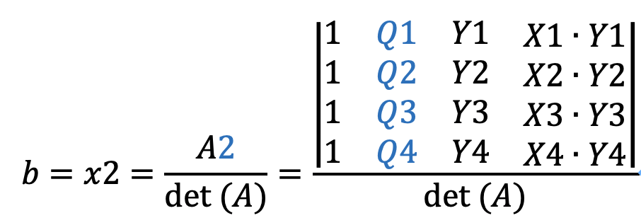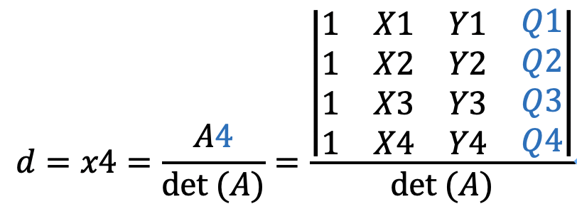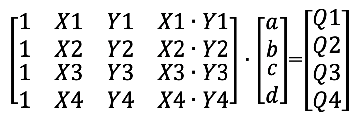 a,b,c,d 为4个待求系数,将4个网格顶点的坐标和Q值代入可得4个方程,写成矩阵