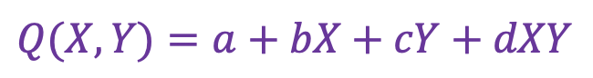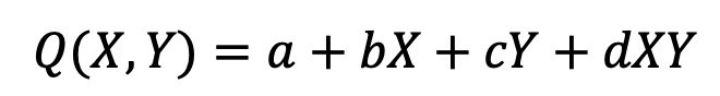 如上述,网格内 Q 值随 X、Y 坐标的变化遵循 “双线性函数关系”,即 可令Q (X,Y) 表示为一个包含 X、Y 线性项及交叉项的二元函数: